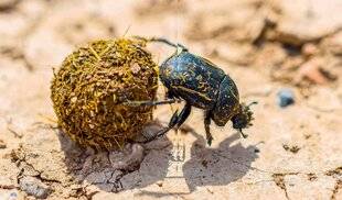 UN RÉGIME UN PEU… BEURK ! Le scarabée sacré est coprophage. Cela veut dire qu'il mange des crottes, plus exactement des bouses de vache. Il en extrait des boules, qu'il fait rouler jusqu'à son terrier. Là, il pourra les déguster à l'abri des concurrents ! À l'été, la femelle enfouit